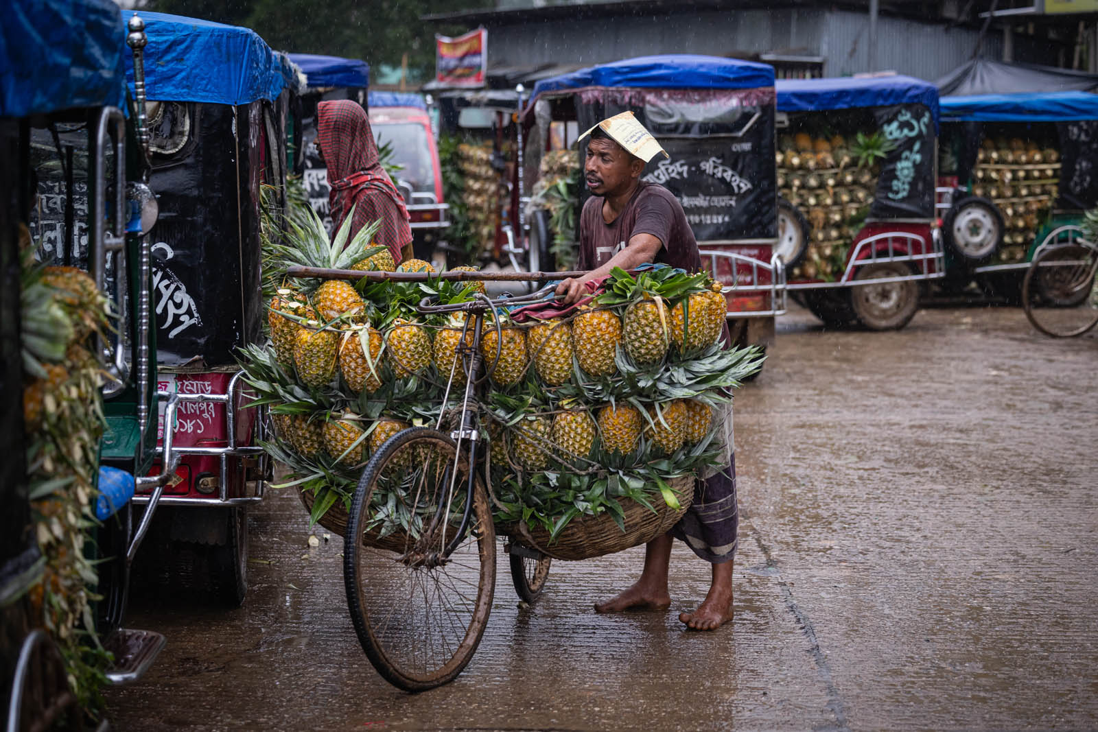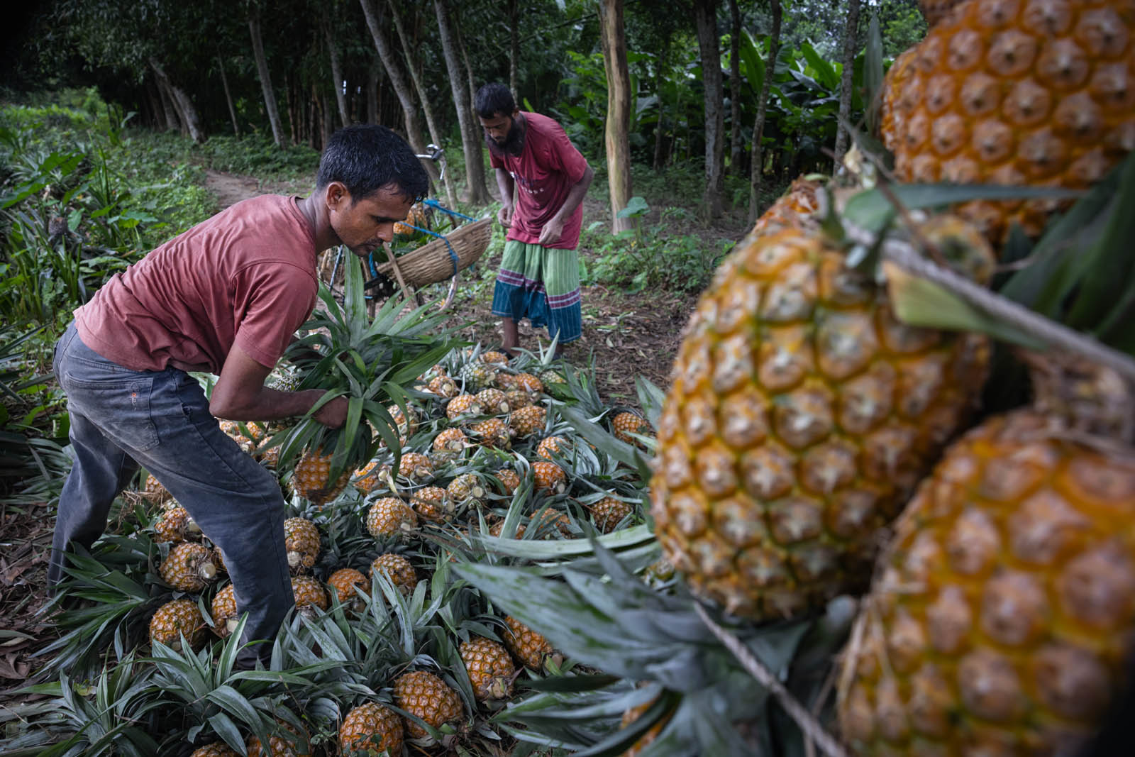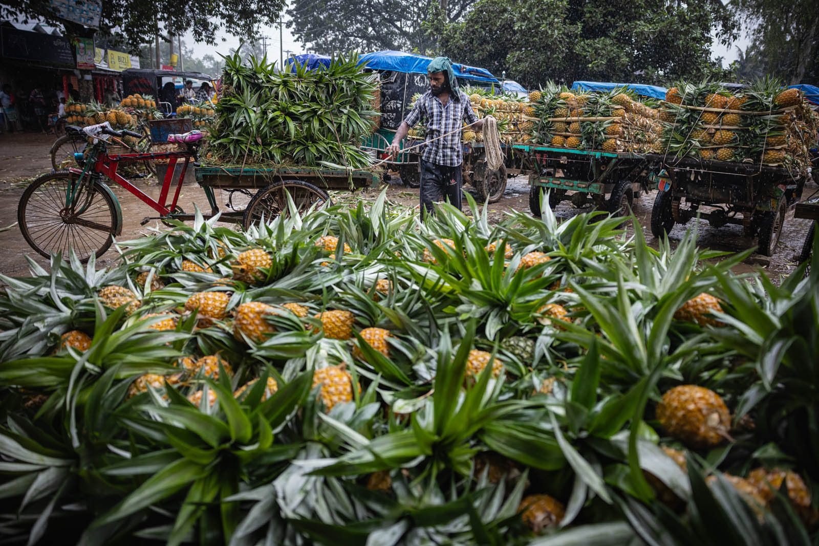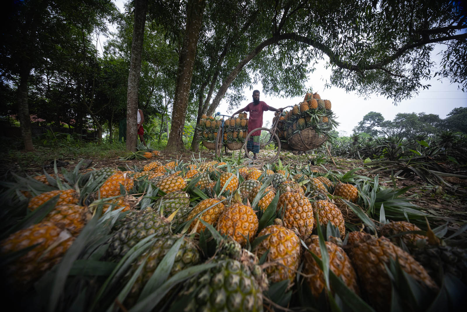 يحمل مزارعون بنغلاديشيون ثمار الأناناس على دراجاتهم الهوائية لبيعها في سوق بمدينة مادوبور في تانجيل، بنغلاديش. ووفقًا لمسؤولي الزراعة في مادوبور، تُزرع الأناناس على مساحة 8000 هكتار، حيث يُنتج 300 ألف طن منها هذا العام، ما يجعلها أكبر منطقة زراعية في البلاد. وتُعرف منطقة مادوبور بعاصمة الأناناس. بدأ زراعة الأناناس في بنغلاديش عام 1942. وكانت جماعة غارو العرقية في قرية إيديلبور، التابعة لبلدة مادوبور، أول من زرع الأناناس، حيث جلبوا 750 شتلة من ميغالايا لبدء الزراعة. وبفضل تطوير هذه الزراعة، تُزرع الأناناس الآن في مناطق مختلفة من البلاد.