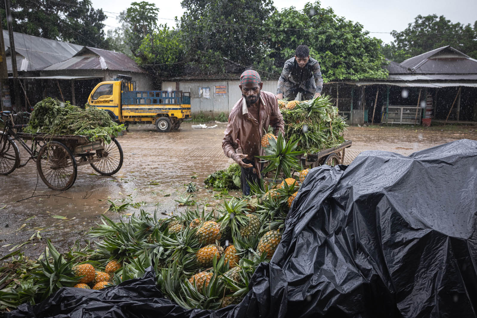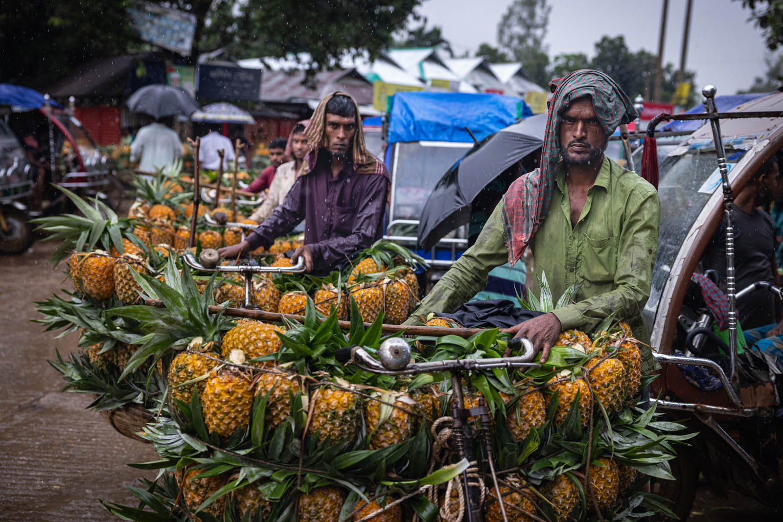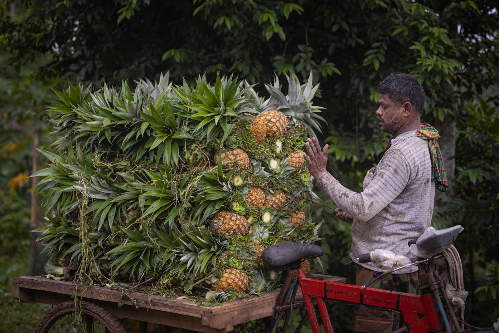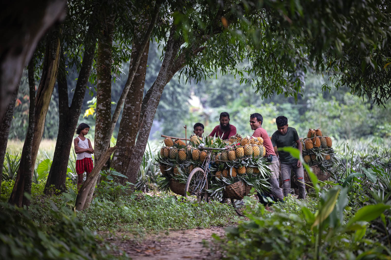 يحمل مزارعون بنغلاديشيون ثمار الأناناس على دراجاتهم الهوائية لبيعها في سوق بمدينة مادوبور في تانجيل، بنغلاديش. ووفقًا لمسؤولي الزراعة في مادوبور، تُزرع الأناناس على مساحة 8000 هكتار، حيث يُنتج 300 ألف طن منها هذا العام، ما يجعلها أكبر منطقة زراعية في البلاد. وتُعرف منطقة مادوبور بعاصمة الأناناس. بدأ زراعة الأناناس في بنغلاديش عام 1942. وكانت جماعة غارو العرقية في قرية إيديلبور، التابعة لبلدة مادوبور، أول من زرع الأناناس، حيث جلبوا 750 شتلة من ميغالايا لبدء الزراعة. وبفضل تطوير هذه الزراعة، تُزرع الأناناس الآن في مناطق مختلفة من البلاد.