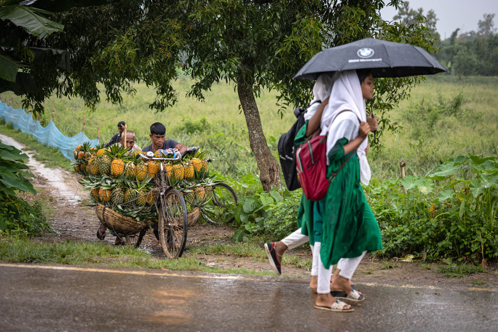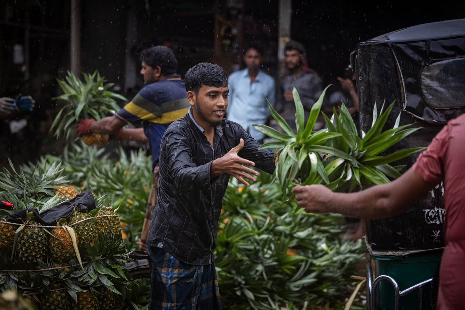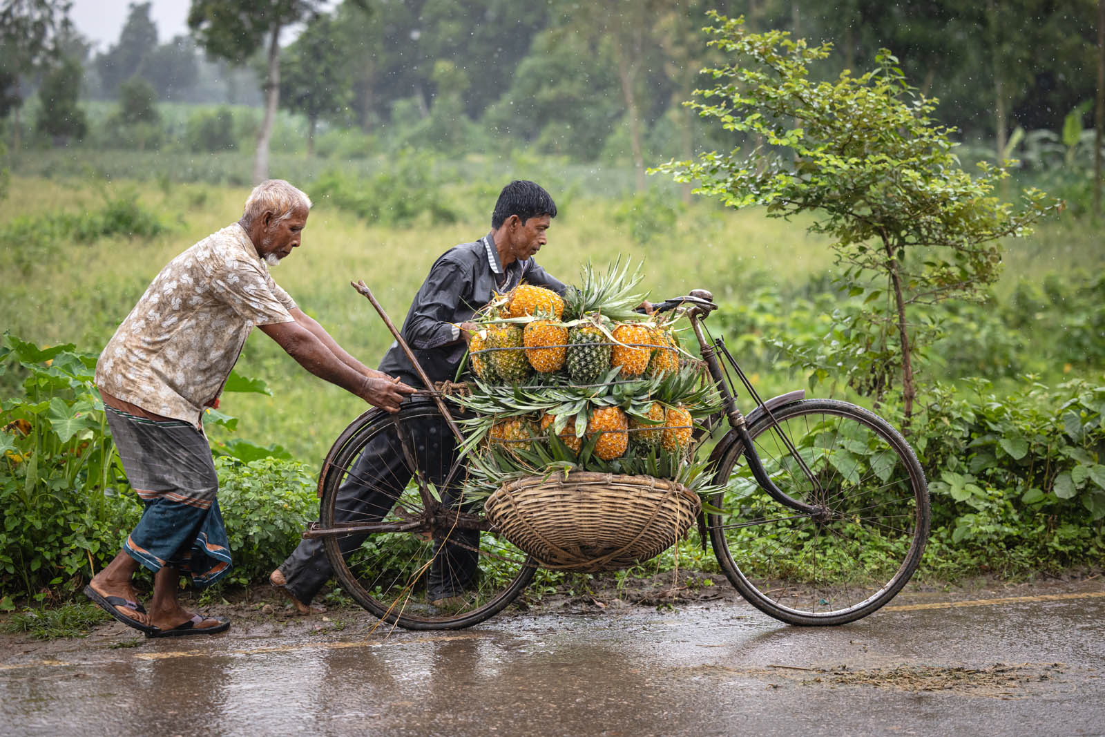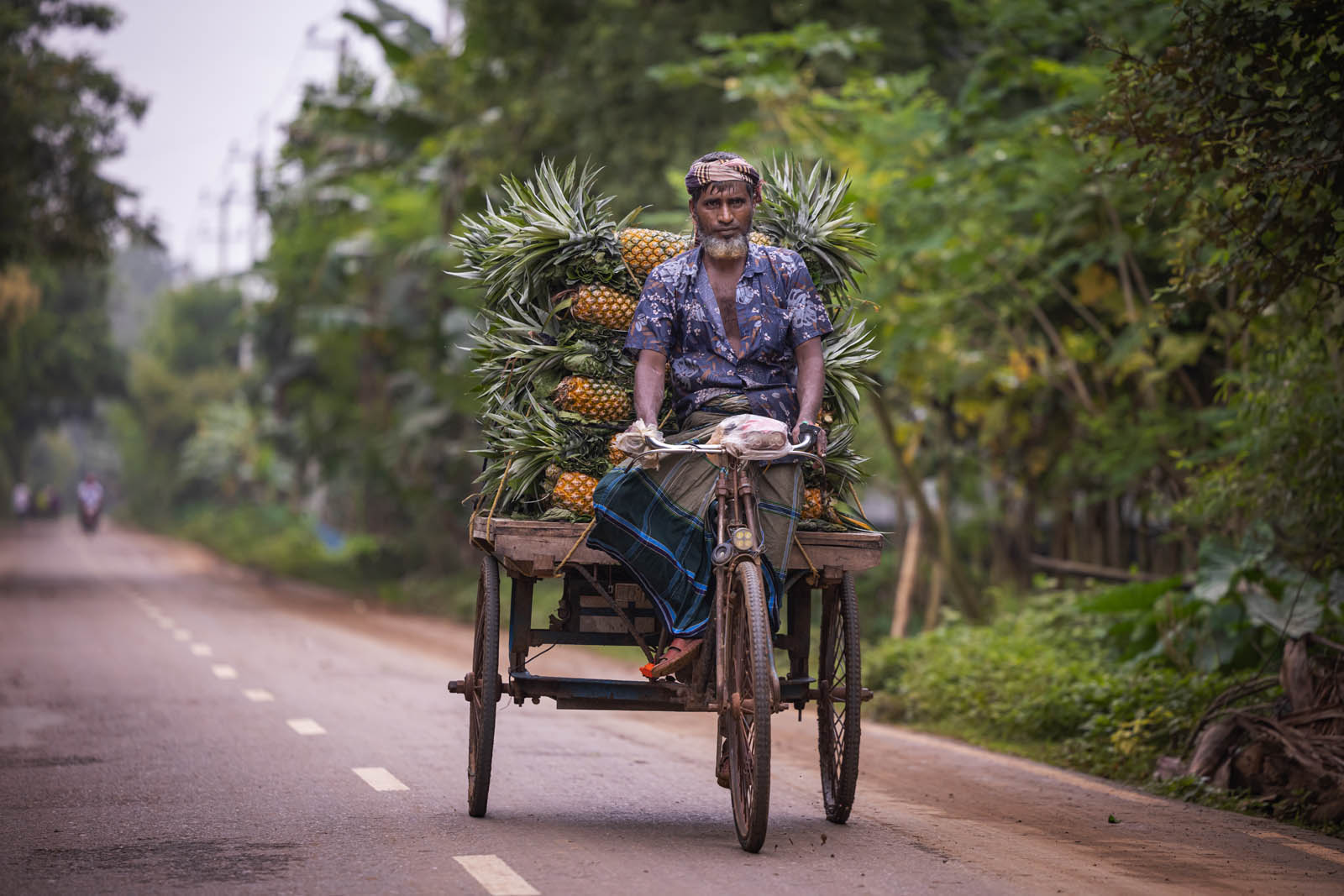 يحمل مزارعون بنغلاديشيون ثمار الأناناس على دراجاتهم الهوائية لبيعها في سوق بمدينة مادوبور في تانجيل، بنغلاديش. ووفقًا لمسؤولي الزراعة في مادوبور، تُزرع الأناناس على مساحة 8000 هكتار، حيث يُنتج 300 ألف طن منها هذا العام، ما يجعلها أكبر منطقة زراعية في البلاد. وتُعرف منطقة مادوبور بعاصمة الأناناس. بدأ زراعة الأناناس في بنغلاديش عام 1942. وكانت جماعة غارو العرقية في قرية إيديلبور، التابعة لبلدة مادوبور، أول من زرع الأناناس، حيث جلبوا 750 شتلة من ميغالايا لبدء الزراعة. وبفضل تطوير هذه الزراعة، تُزرع الأناناس الآن في مناطق مختلفة من البلاد.