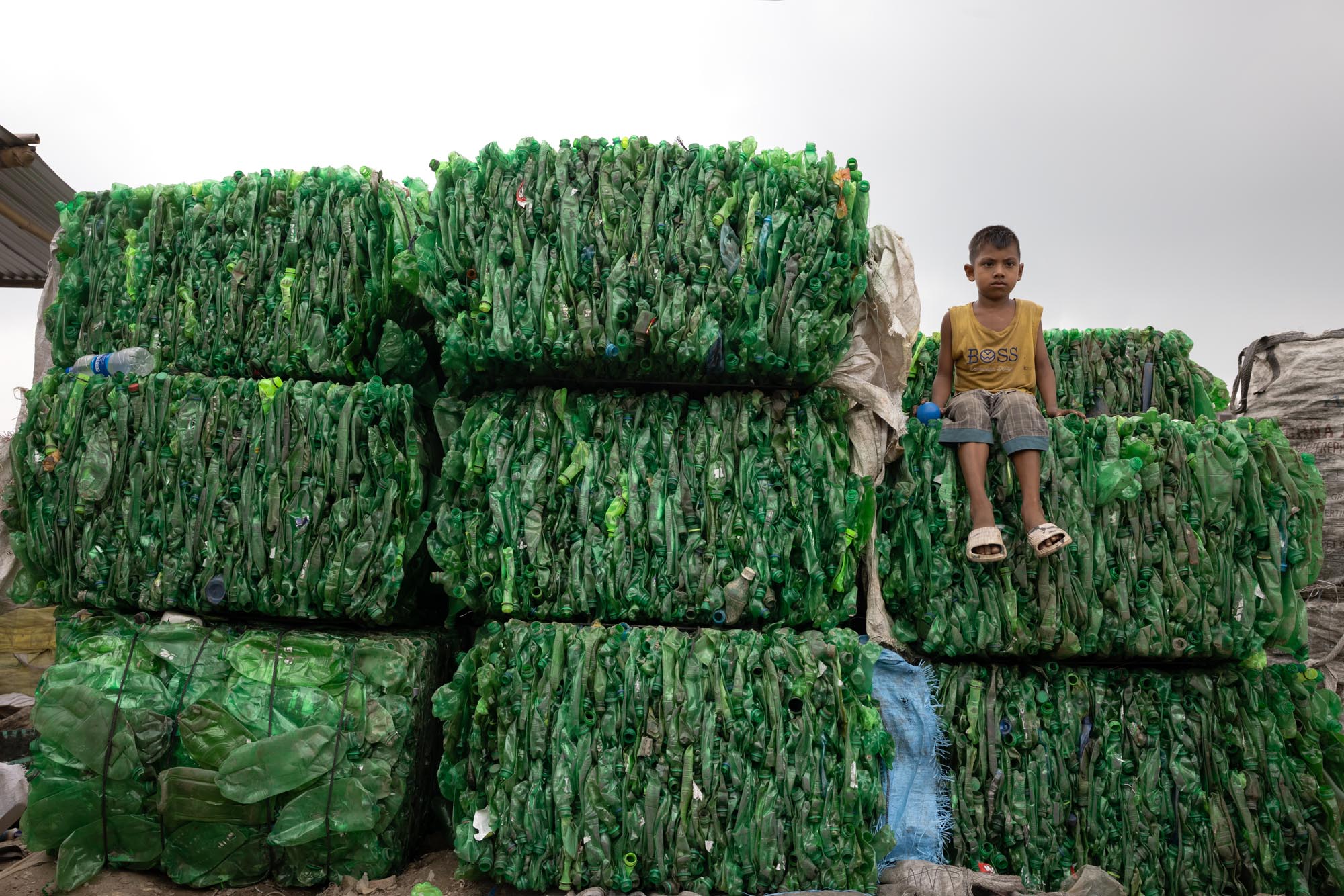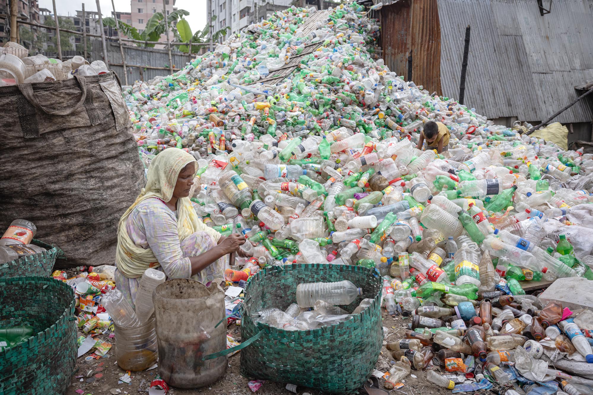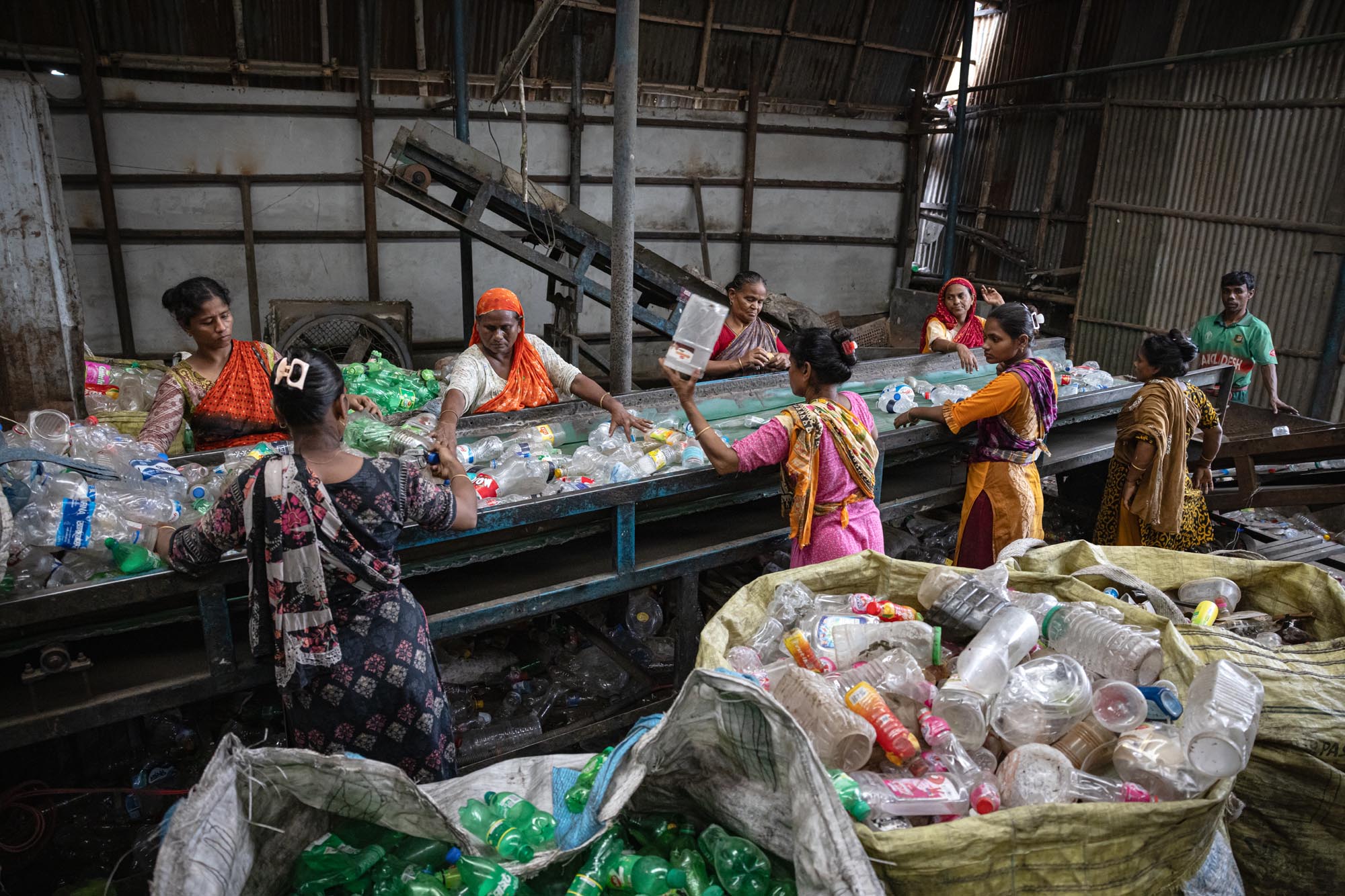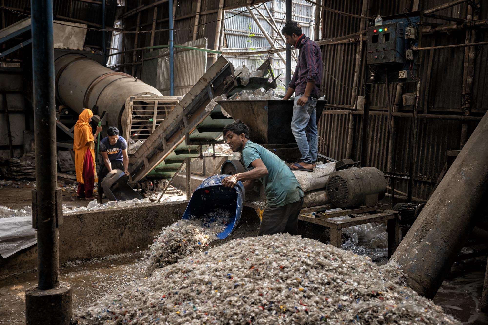 عمال يعيدون تدوير الزجاجات البلاستيكية في دكا، بنغلاديش يوجد العديد من مصانع إعادة تدوير الزجاجات البلاستيكية في دكا حيث يعمل أشخاص من مختلف الأعمار معًا بينما كثير منهم أطفال، تخلق هذه المصانع فرص عمل جديدة للفقراء الذين يعيشون في ضواحي العاصمة، تقريبًا 200 مصنع يعمل في إعادة تدوير الزجاجات البلاستيكية، ويتراوح متوسط الدخل من 80 إلى 200 تاكا، ويكسب الأخير عامل يعمل حوالي 10 إلى 12 ساعة، ويتم جمع الزجاجات البلاستيكية بشكل رئيسي من قبل الباعة المتجولين وأطفال الشوارع، ويقدر أن نظرًا لأن ما يقرب من 100.000 من جامعي النفايات يعملون في دكا وحدها، فإن الأطفال الذين يجمعون النفايات في دكا يُعرفون شعبيًا باسم “توكاي”، والذي سيتم بيعه لاحقًا للمصانع المحلية. تقوم المصانع اليومية مثل تلك بإعادة تدوير آلاف الزجاجات لتصنيع أنواع مختلفة من المنتجات البلاستيكية، أو يتم تصديرها إلى خارج البلاد.