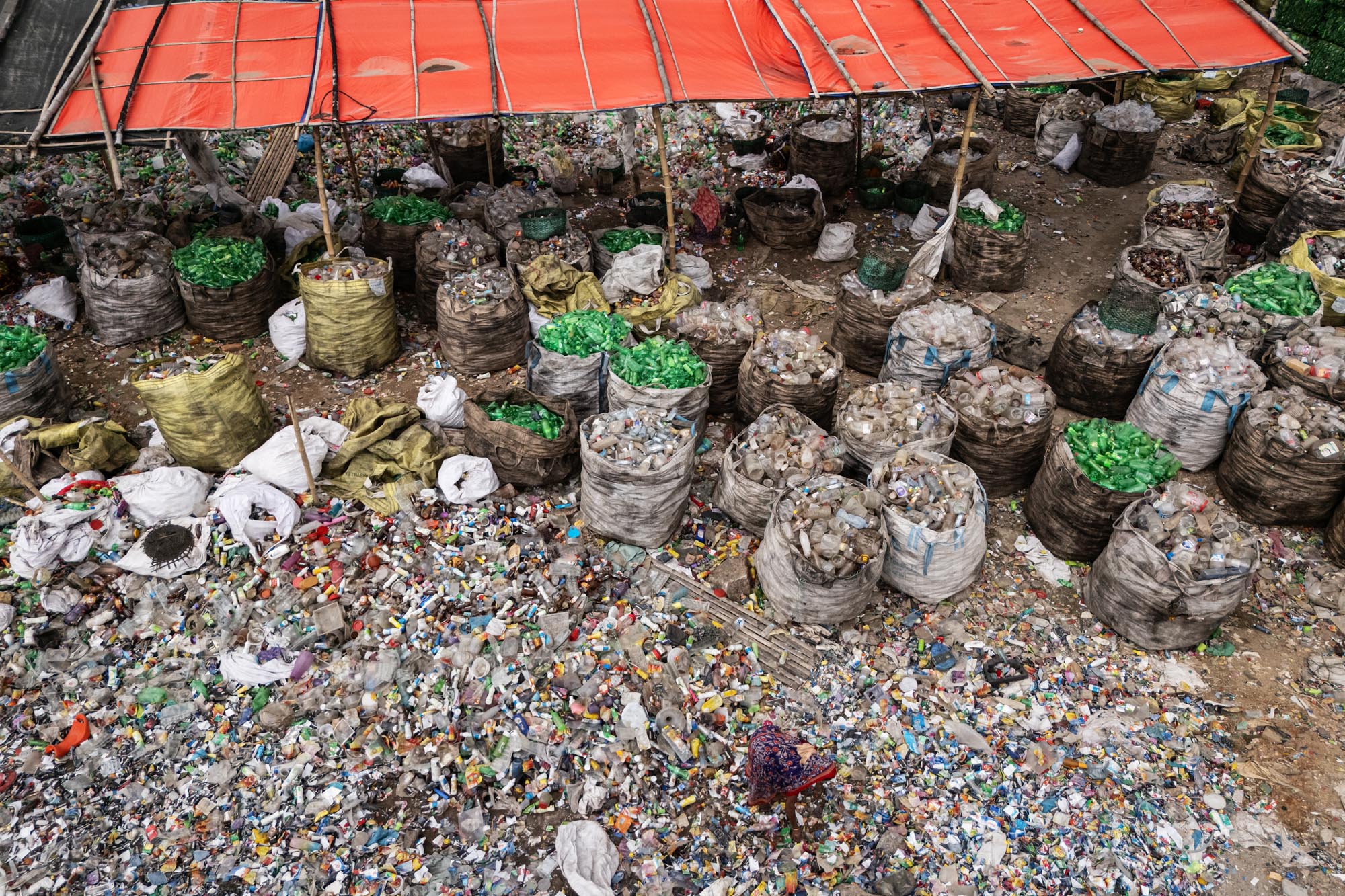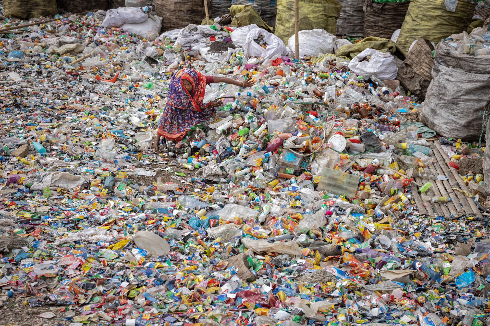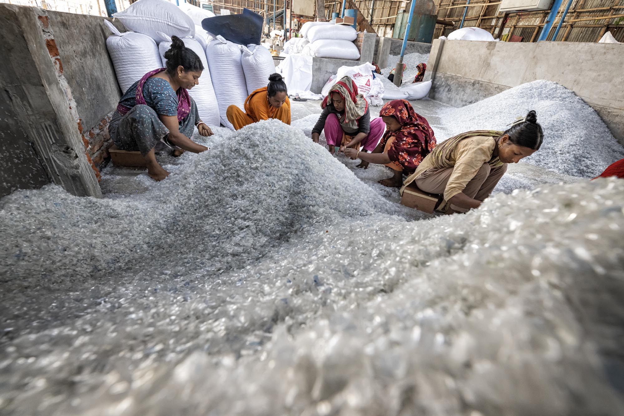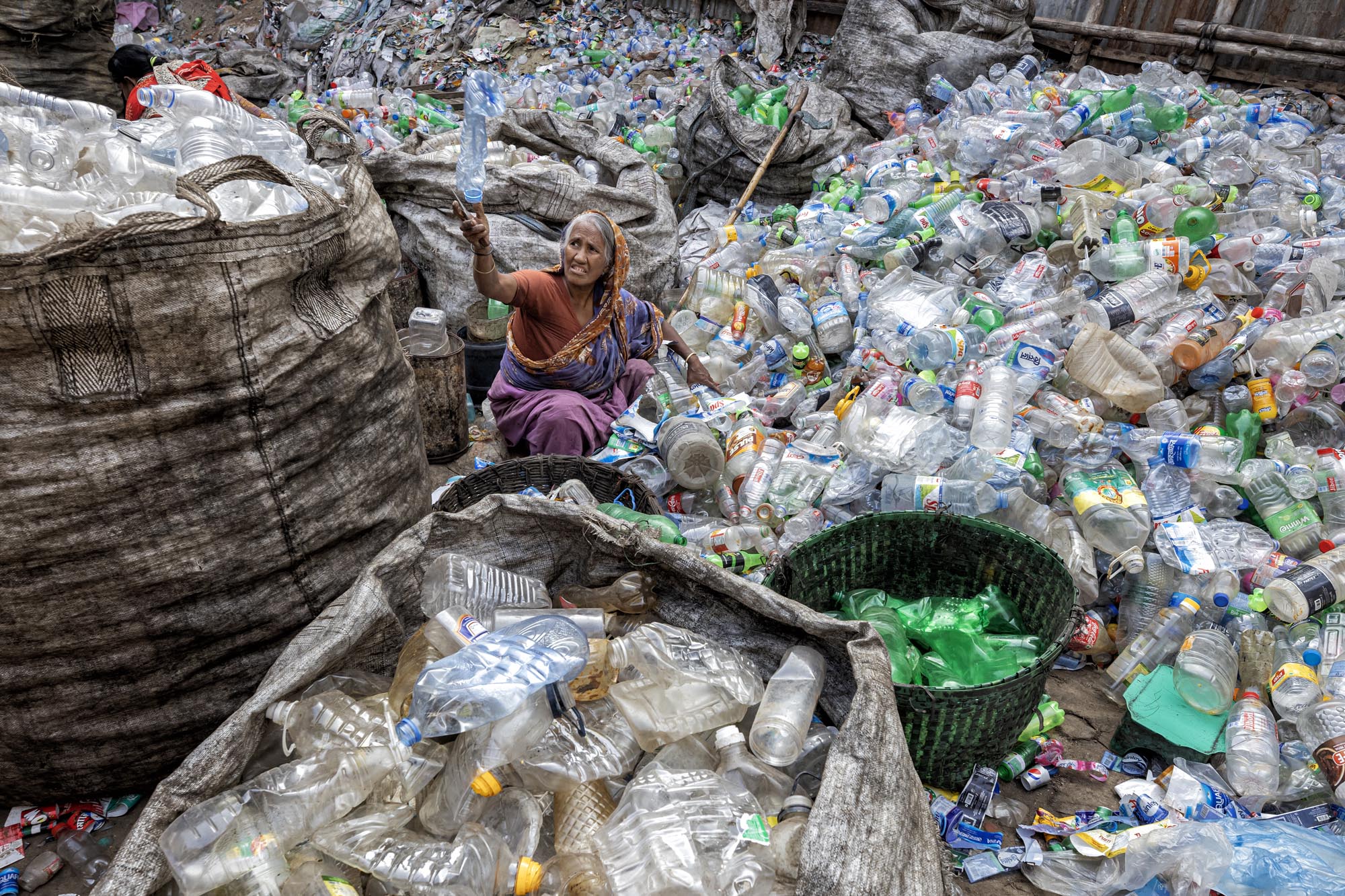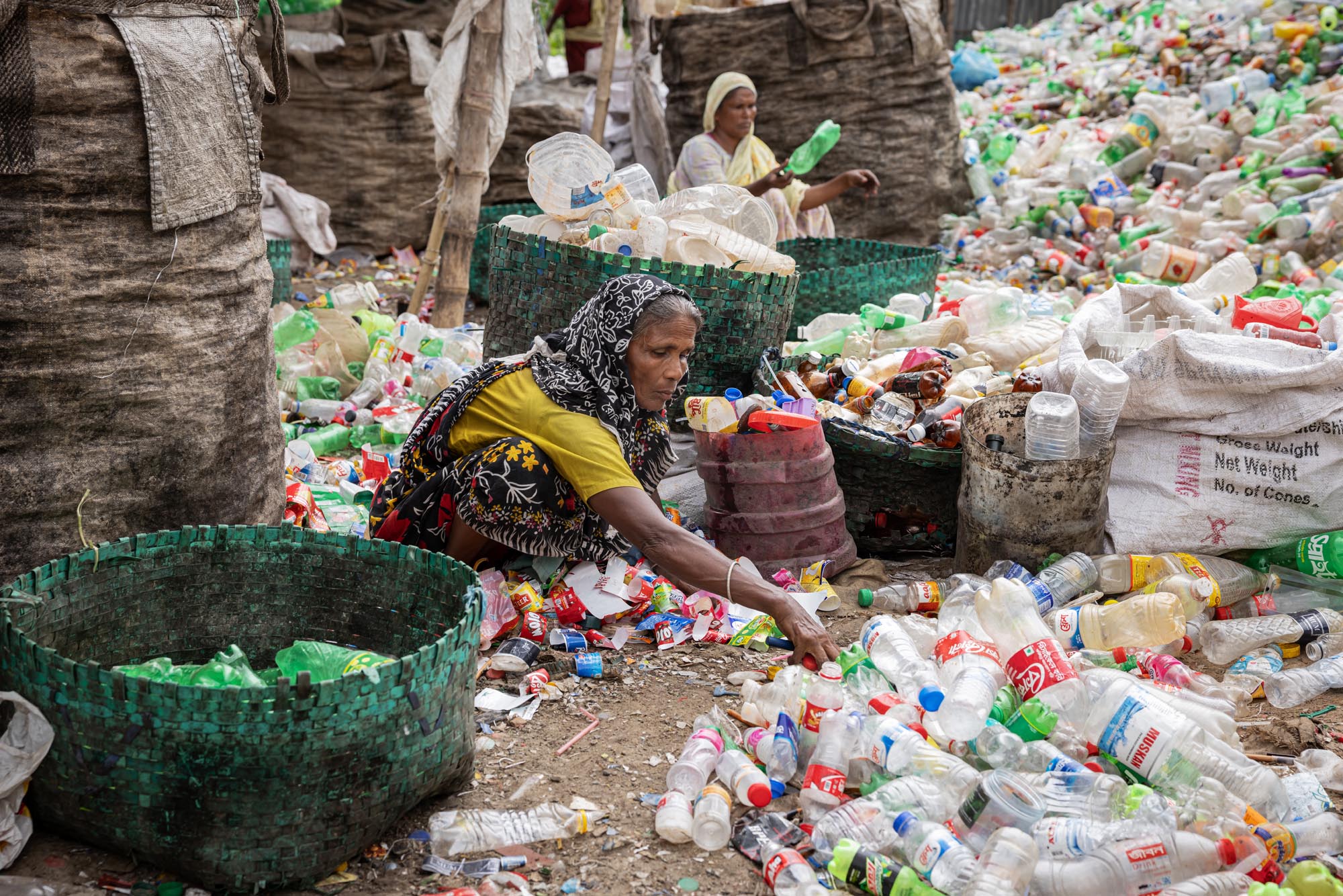 عمال يعيدون تدوير الزجاجات البلاستيكية في دكا، بنغلاديش يوجد العديد من مصانع إعادة تدوير الزجاجات البلاستيكية في دكا حيث يعمل أشخاص من مختلف الأعمار معًا بينما كثير منهم أطفال، تخلق هذه المصانع فرص عمل جديدة للفقراء الذين يعيشون في ضواحي العاصمة، تقريبًا 200 مصنع يعمل في إعادة تدوير الزجاجات البلاستيكية، ويتراوح متوسط الدخل من 80 إلى 200 تاكا، ويكسب الأخير عامل يعمل حوالي 10 إلى 12 ساعة، ويتم جمع الزجاجات البلاستيكية بشكل رئيسي من قبل الباعة المتجولين وأطفال الشوارع، ويقدر أن نظرًا لأن ما يقرب من 100.000 من جامعي النفايات يعملون في دكا وحدها، فإن الأطفال الذين يجمعون النفايات في دكا يُعرفون شعبيًا باسم “توكاي”، والذي سيتم بيعه لاحقًا للمصانع المحلية. تقوم المصانع اليومية مثل تلك بإعادة تدوير آلاف الزجاجات لتصنيع أنواع مختلفة من المنتجات البلاستيكية، أو يتم تصديرها إلى خارج البلاد.