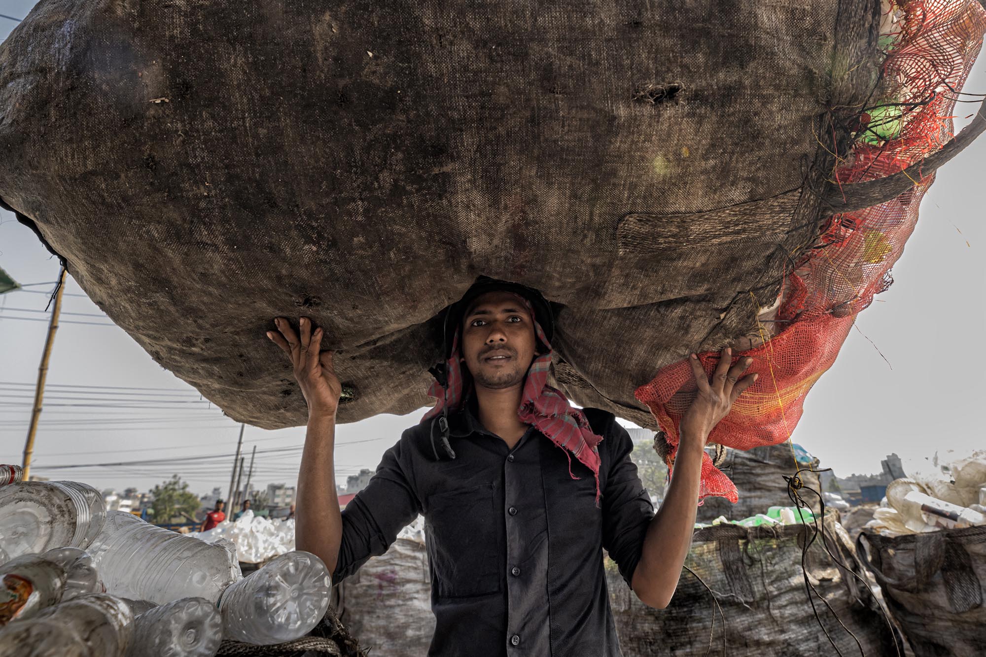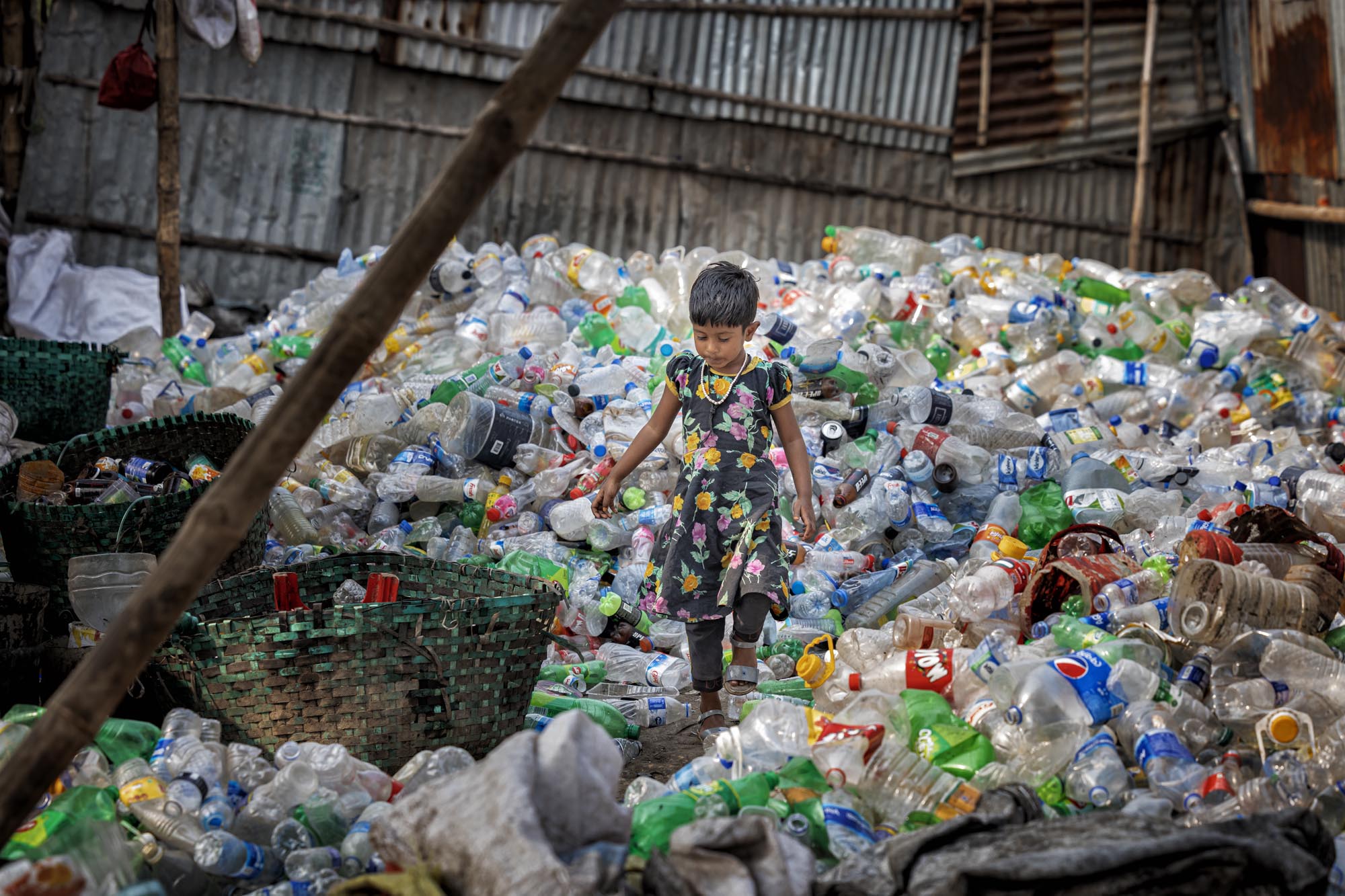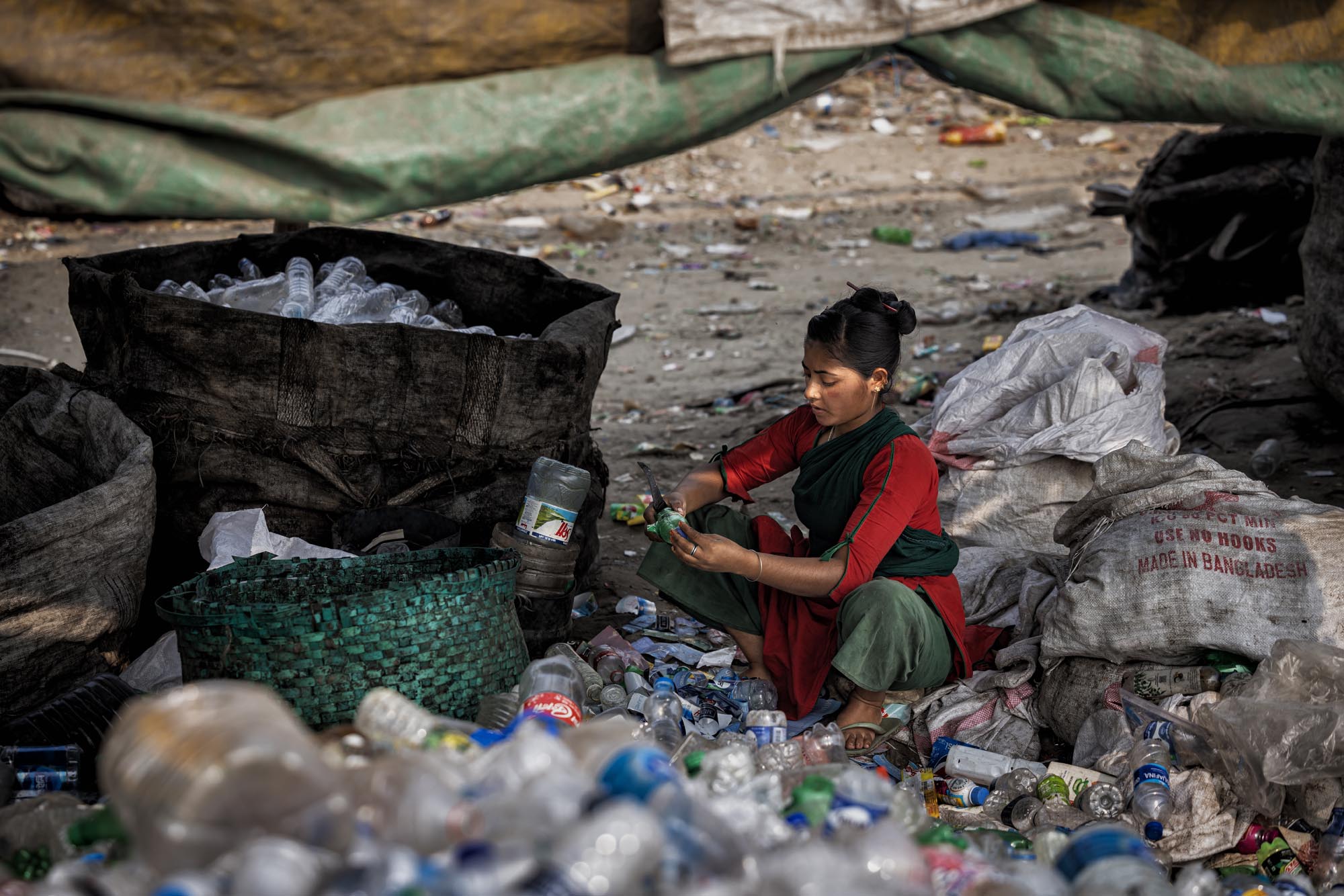 Workers Recycling Plastic Bottles in Dhaka, Bangladesh There are many plastic bottle recycling factory located in Dhaka where people from different age works together while many of them are children, Such factories creates new jobs for the poor people living in the outskirt in the capital,nearly 200 factories engaged in recycling plastic bottles,The average earnings range from 80 to 200 tk, the latter being earned by a worker who clocks about 10 to 12 hours of work, The plastic bottles are mainly collected by hawkers and street children, It is estimated that nearly 100,000 waste pickers work in Dhaka alone, waste picking children in Dhaka are popularly known as ‘tokai’, which will be later on sales to local factories. Everyday factories like those recycles thousands of bottles to make different kinds of plastic made products, Or it is exported outside the country.